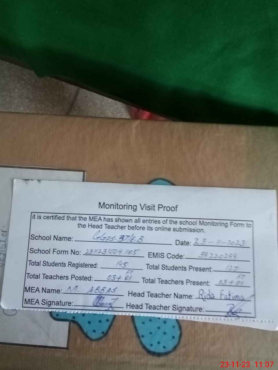 | Attendance Register | Head Teacher | MEA with School | Visit Proof |