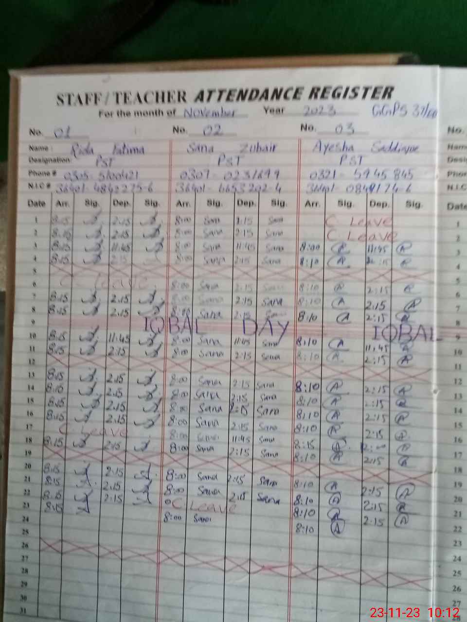 | CNIC | Full Name | Designation | R/C | Absence During Last Calender Month |