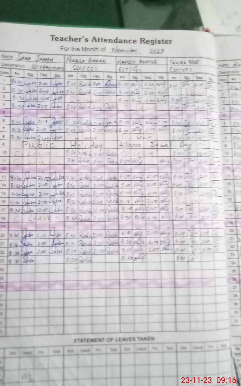 | CNIC | Full Name | Designation | R/C | Absence During Last Calender Month |