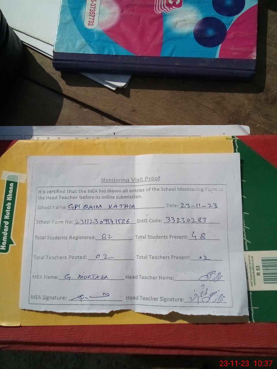 | Attendance Register | Head Teacher | MEA with School | Visit Proof |