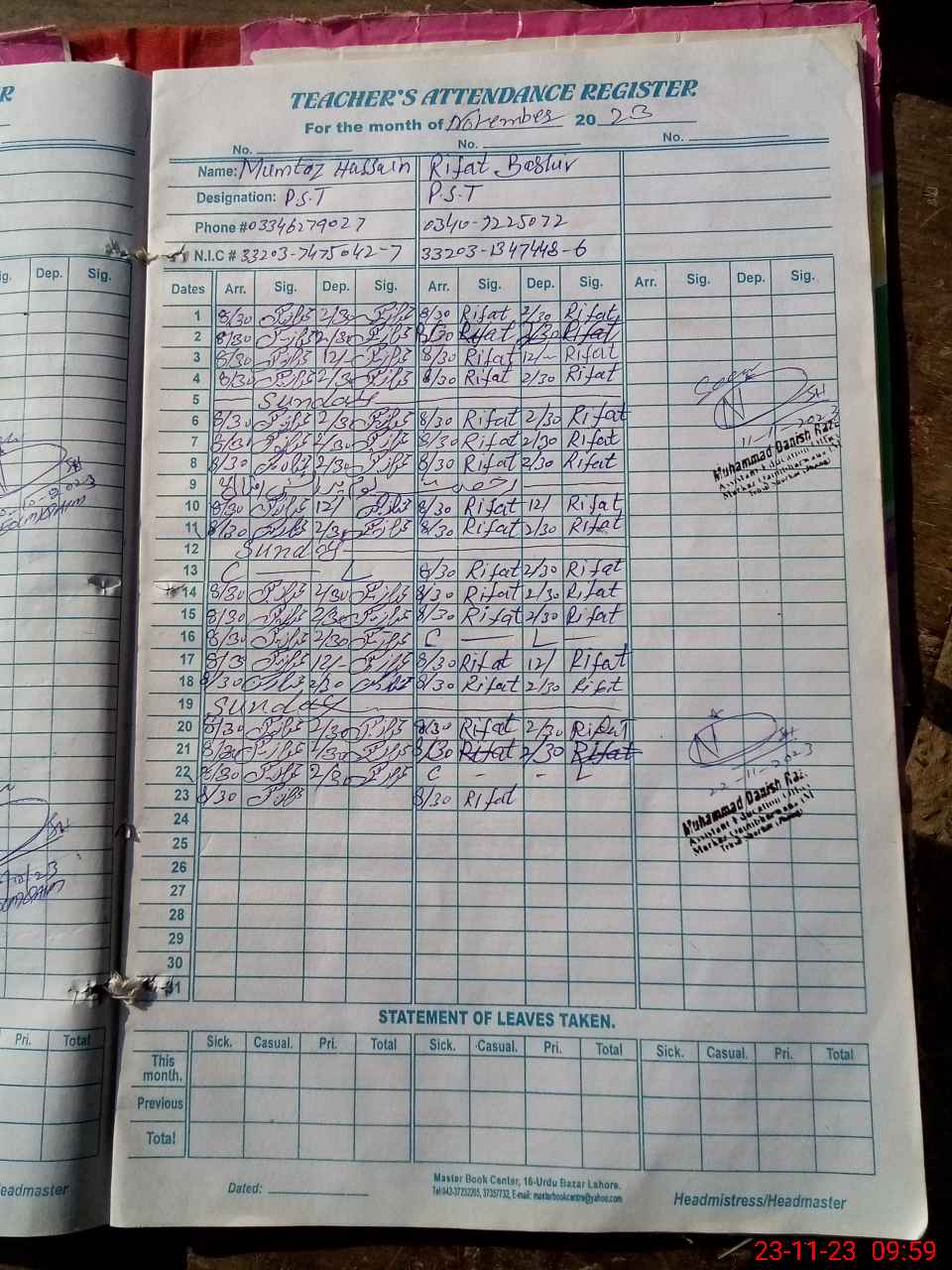 | Name: MU**** HU**** Designation: (School Headmaster's/Headmistress's) PST Phone/Cell Number: 03**** |