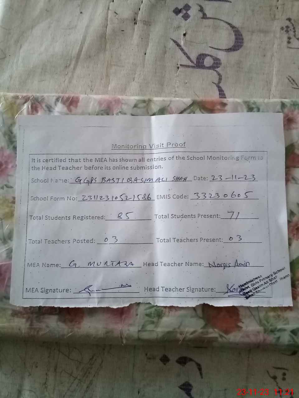 | Attendance Register | Head Teacher | MEA with School | Visit Proof |