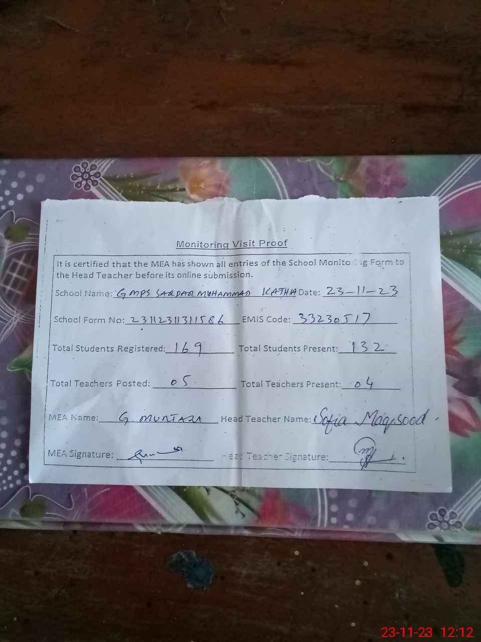 | Attendance Register | Head Teacher | MEA with School | Visit Proof |