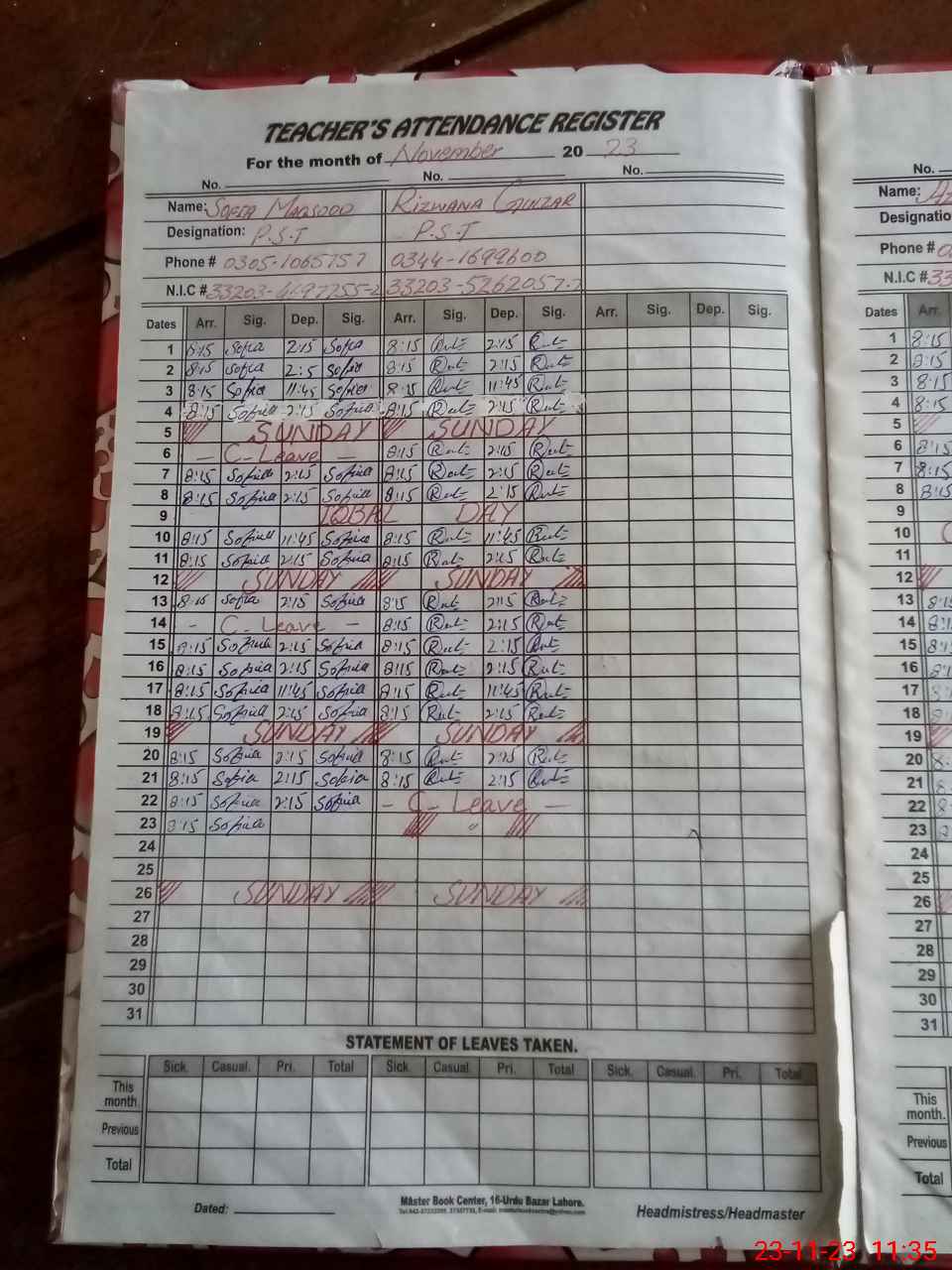 | CNIC | Full Name | Designation | R/C | Absence During Last Calender Month |