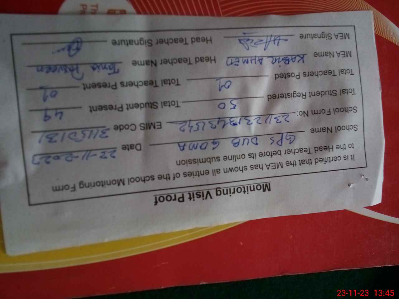 | Attendance Register | Head Teacher | MEA with School | Visit Proof |