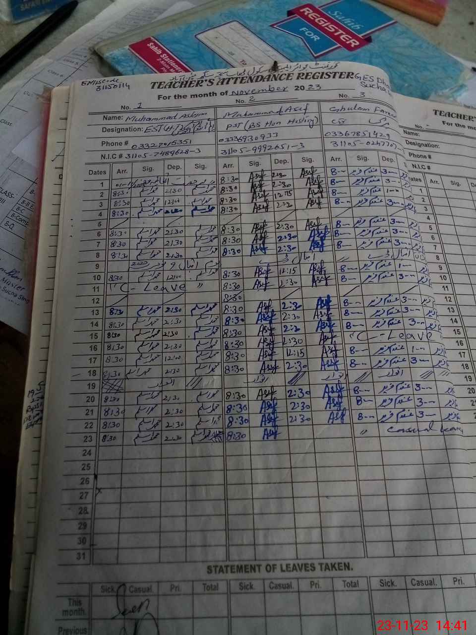 | CNIC | Full Name | Designation | R/C | Absence During Last Calender Month |