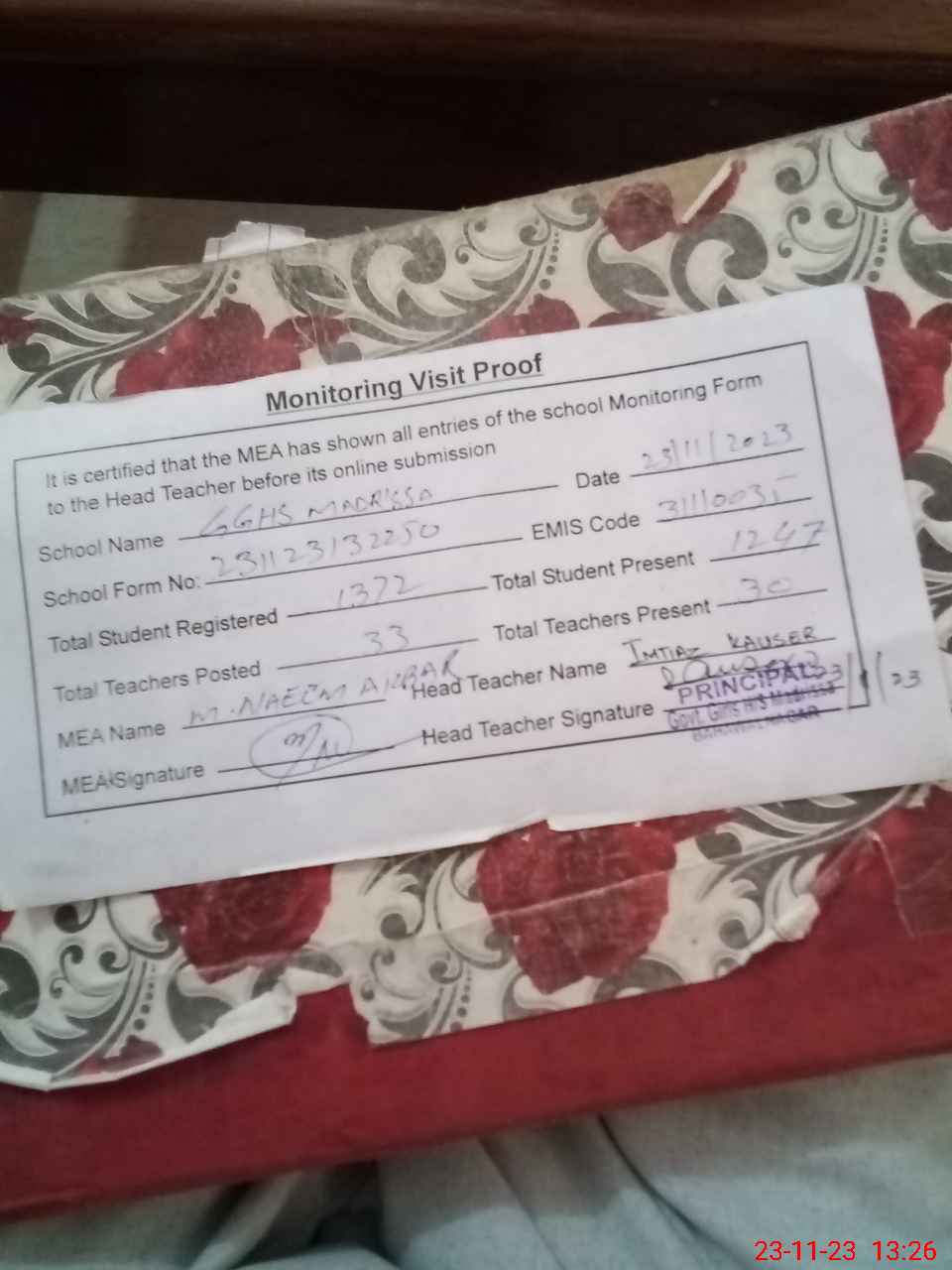 | Attendance Register | Head Teacher | MEA with School | Visit Proof |