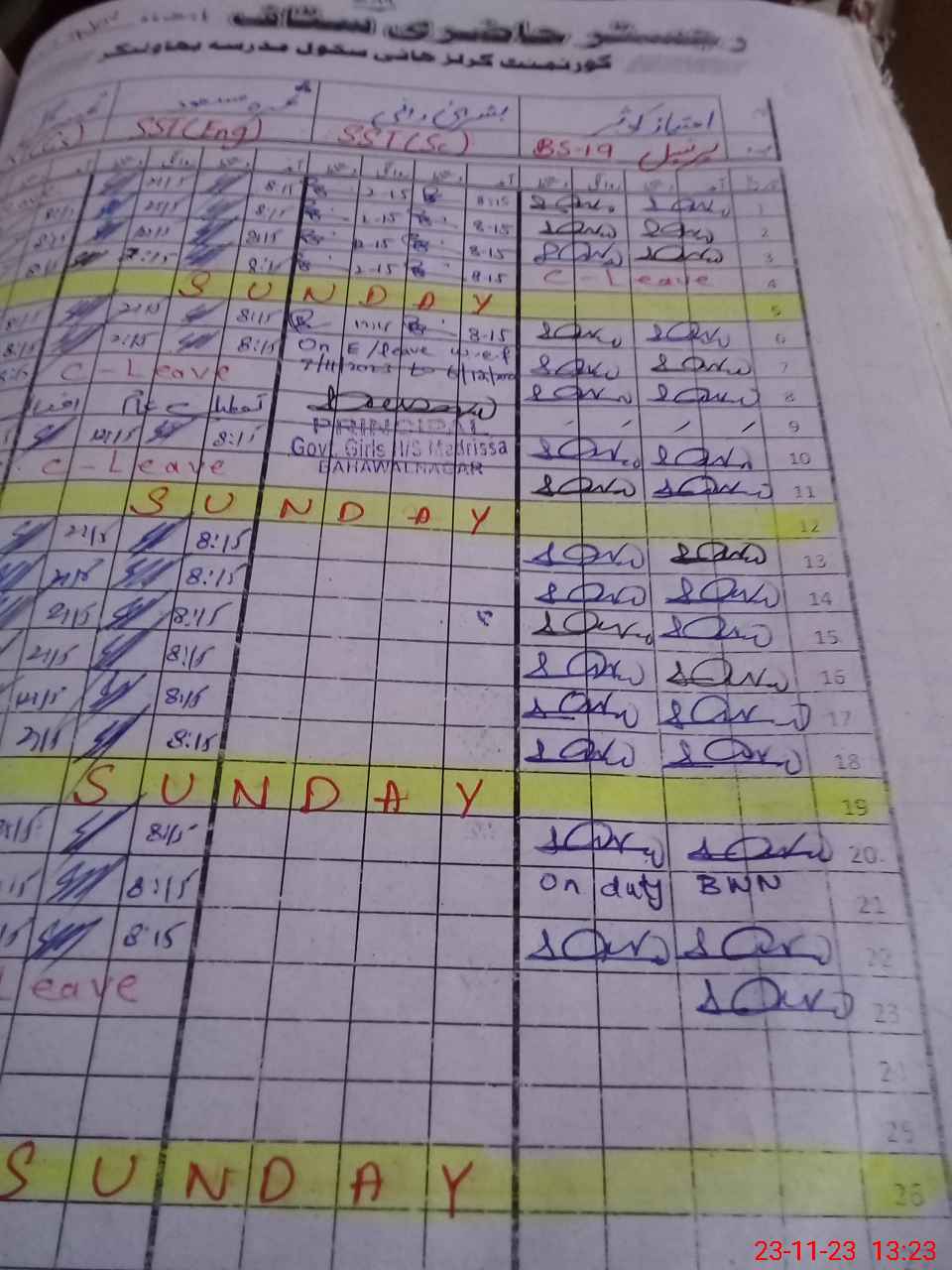 | CNIC | Full Name | Designation | R/C | Absence During Last Calender Month |