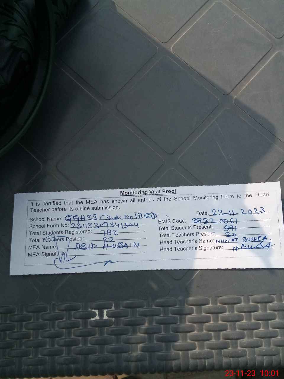 | Attendance Register | Head Teacher | MEA with School | Visit Proof |