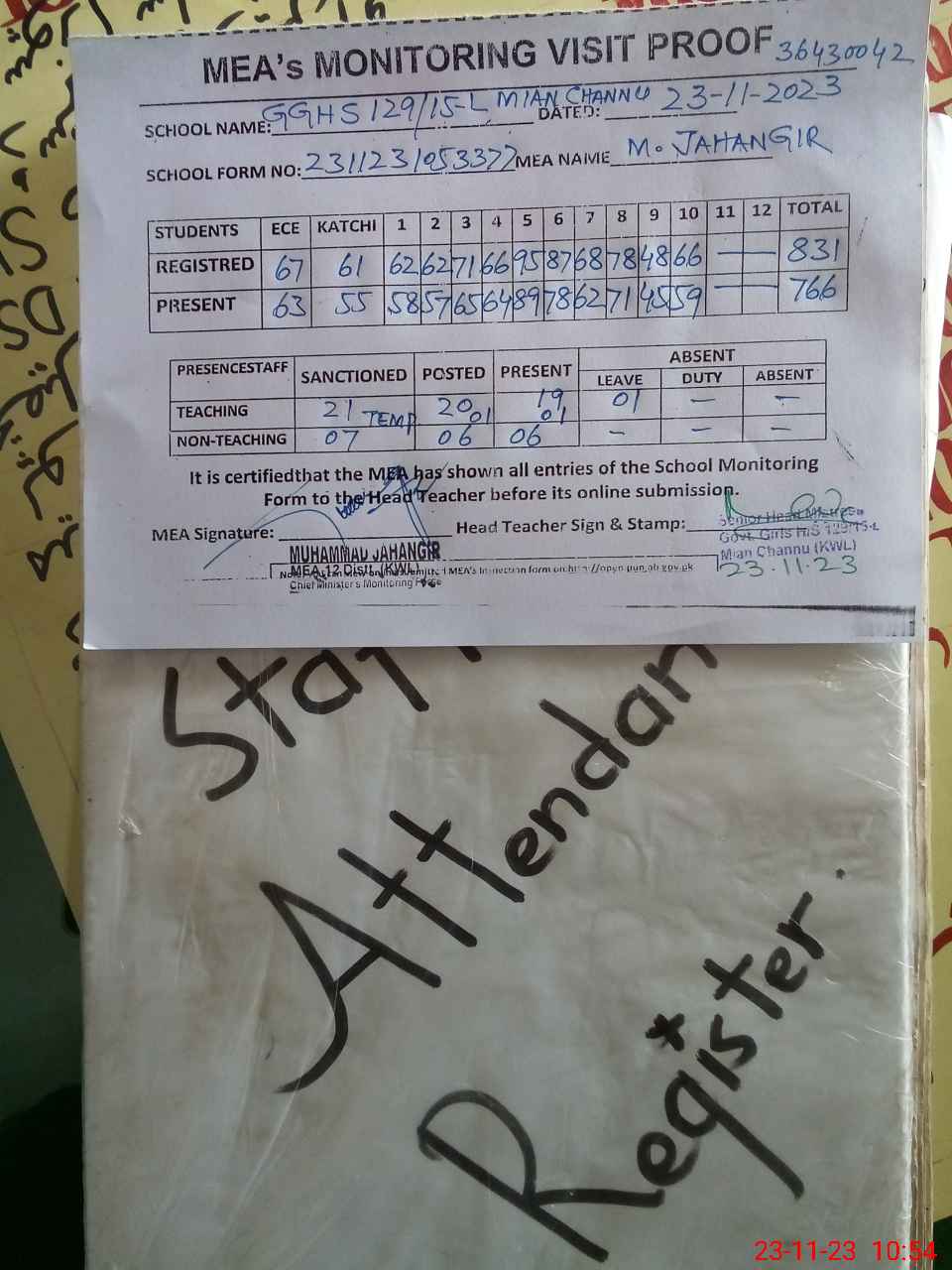 | Attendance Register | Head Teacher | MEA with School | Visit Proof |