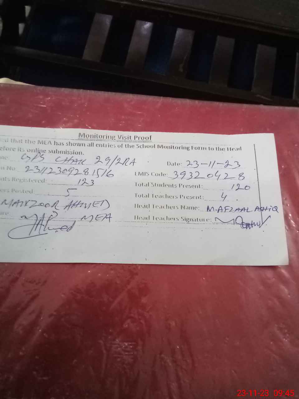 | Attendance Register | Head Teacher | MEA with School | Visit Proof |