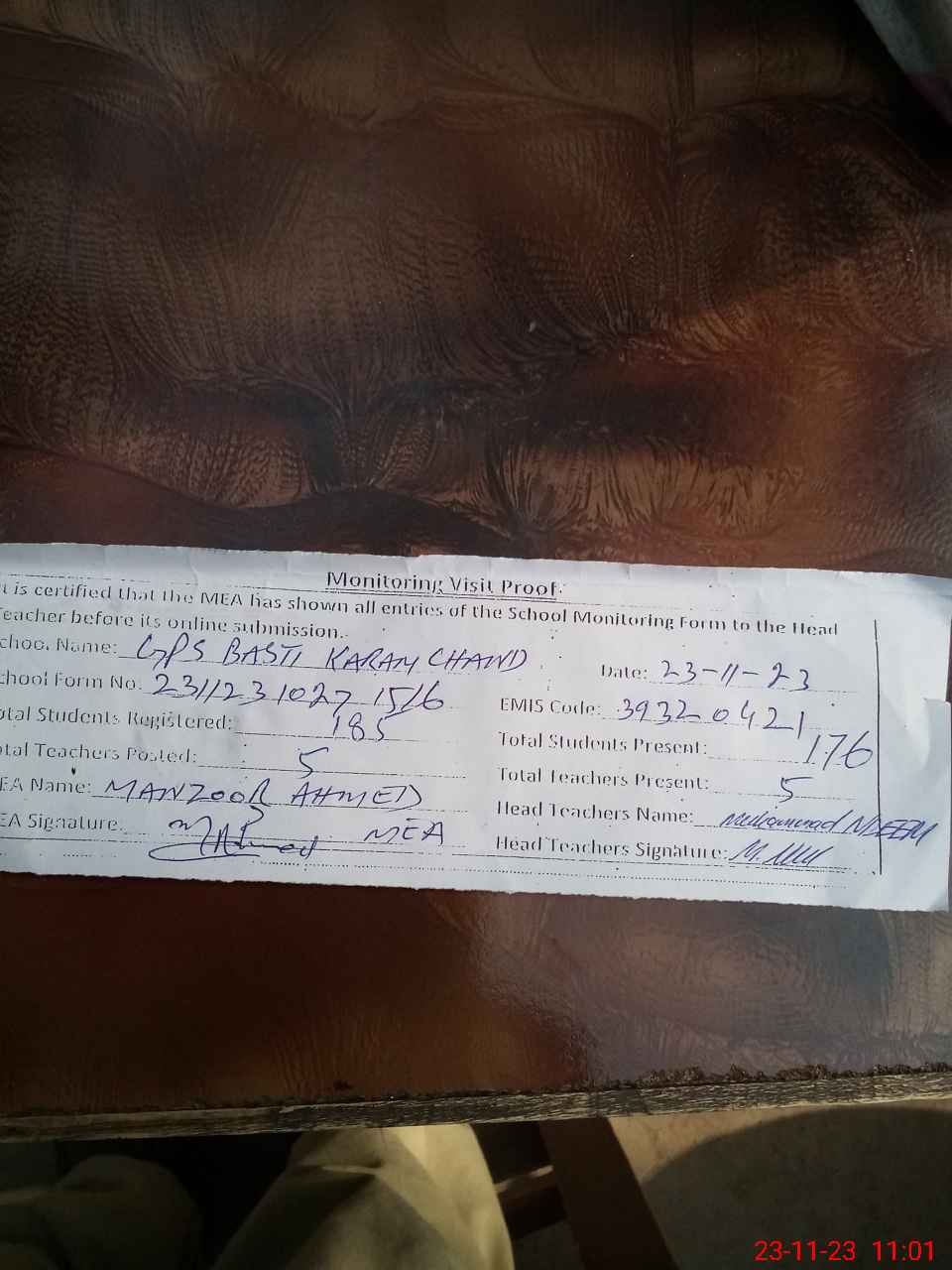| Attendance Register | Head Teacher | MEA with School | Visit Proof |
