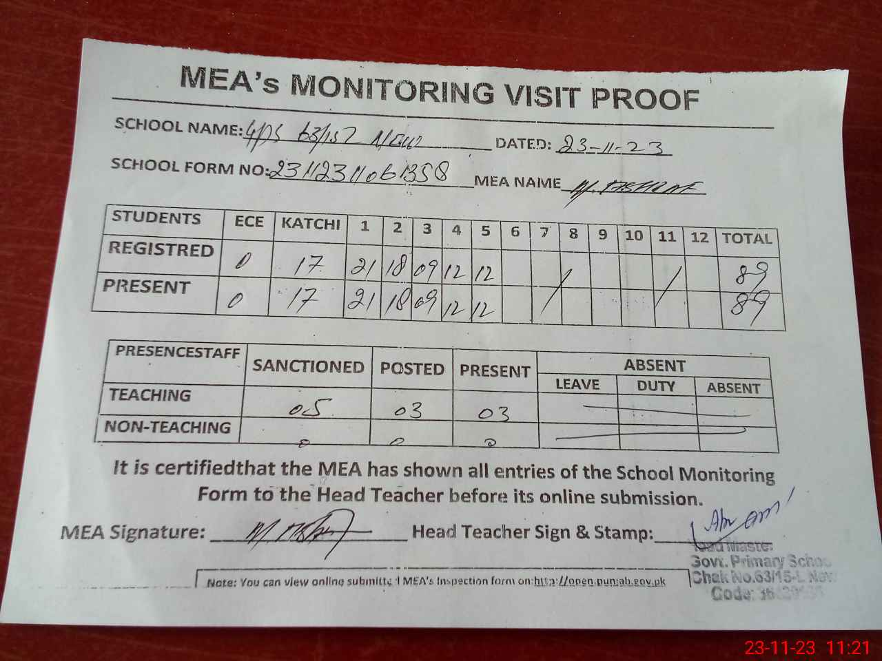 | Attendance Register | Head Teacher | MEA with School | Visit Proof |