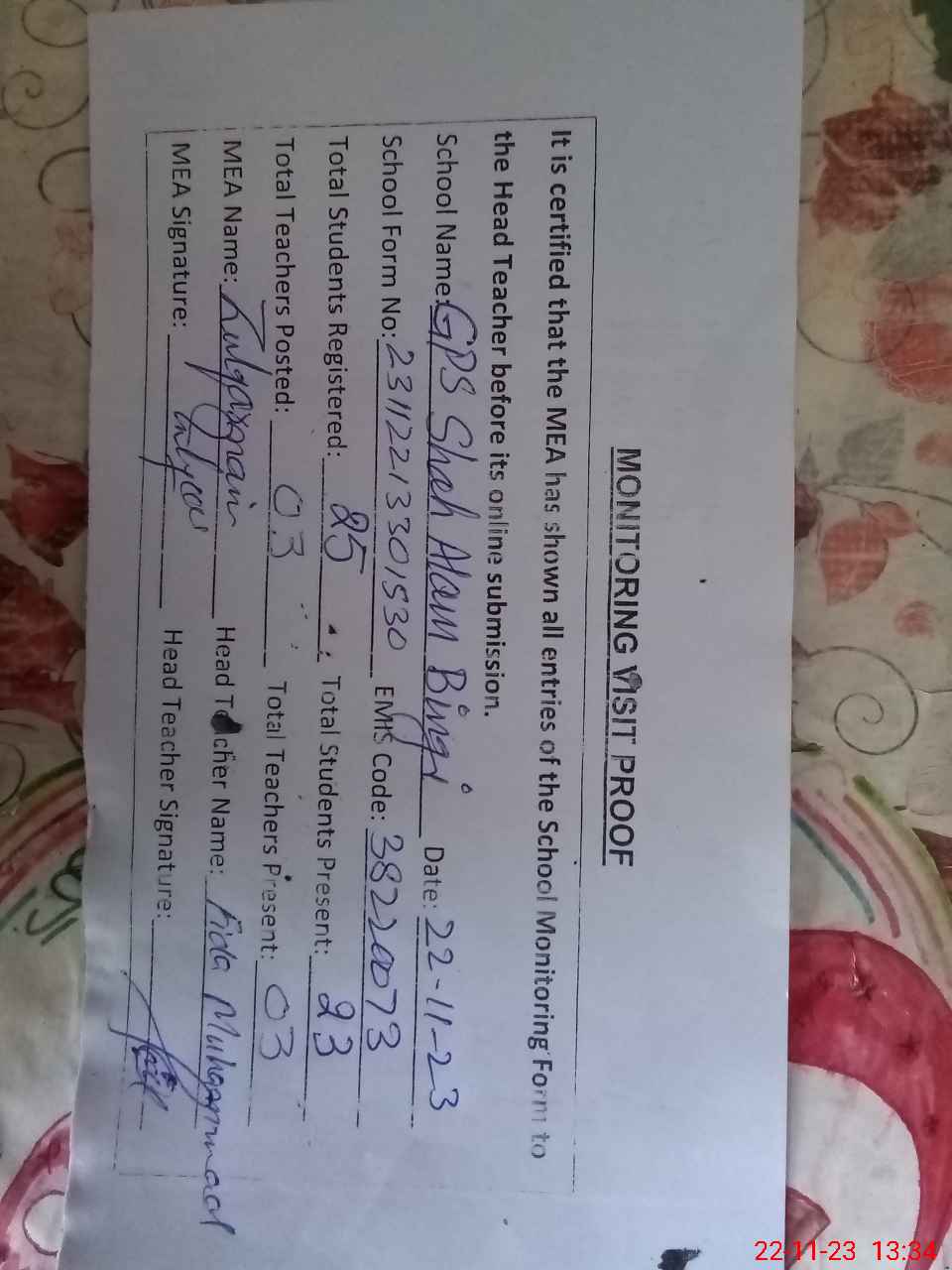 | EMIS Code: 38220073 | Name of School: GPS SHAH ALAM BINGI | |||