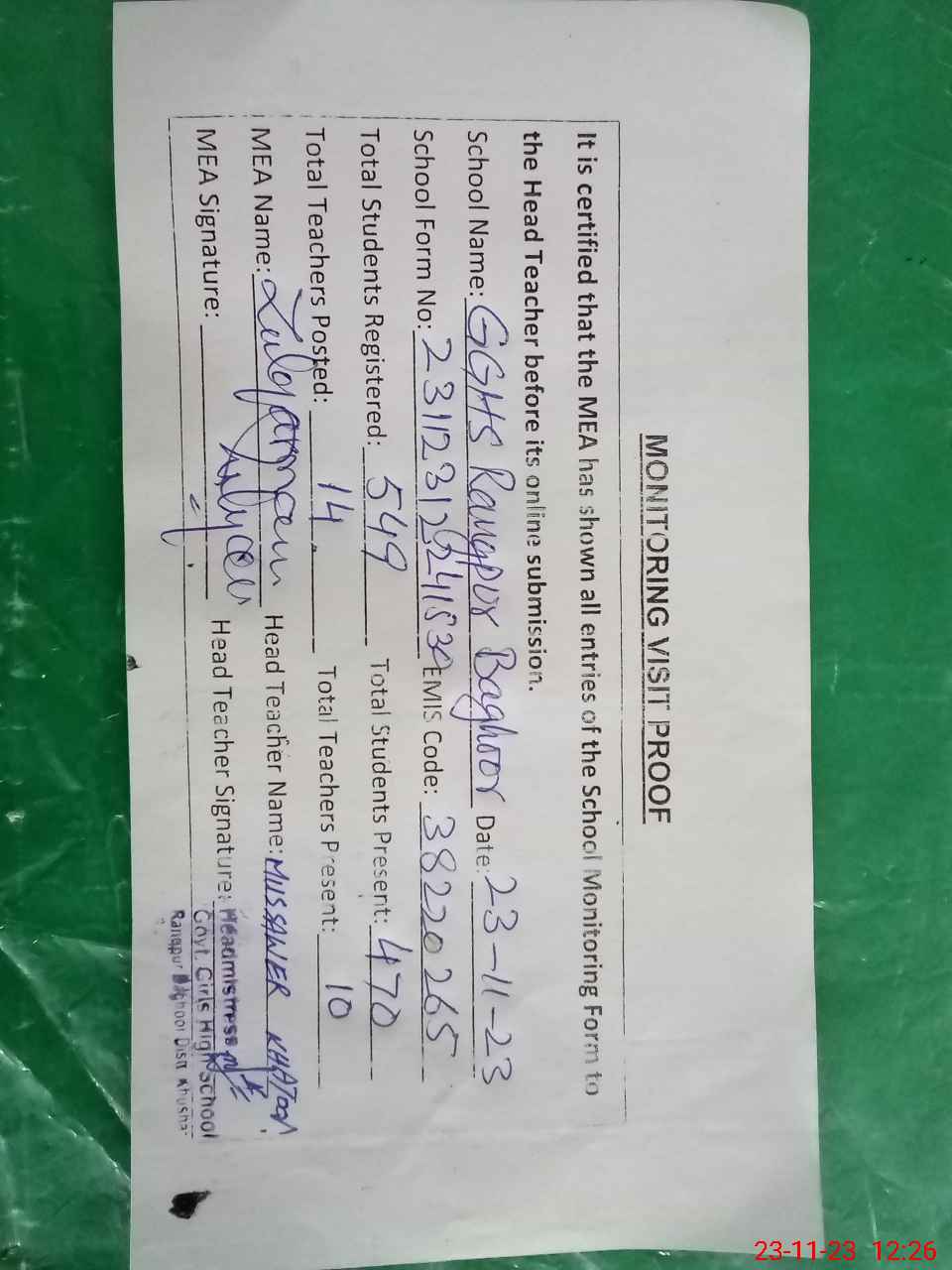 | Attendance Register | Head Teacher | MEA with School | Visit Proof |