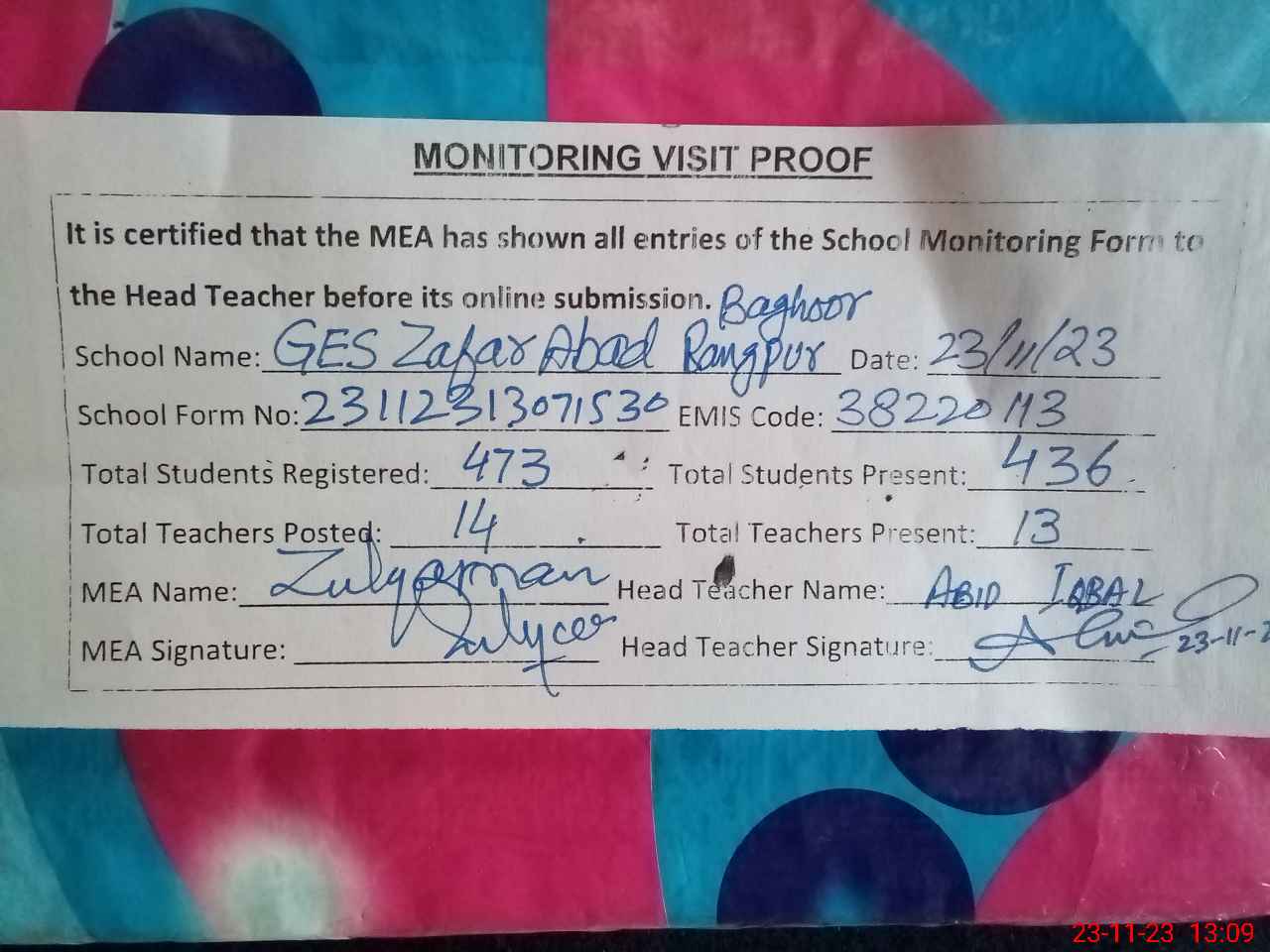 | EMIS Code: 38220113 | Name of School: GES ZAFAR ABAD RANG PUR BAGHOOR | |||