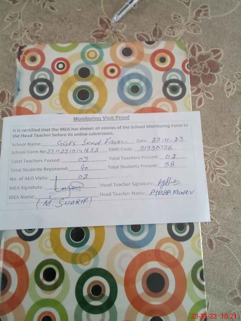 | Attendance Register | Head Teacher | MEA with School | Visit Proof |
