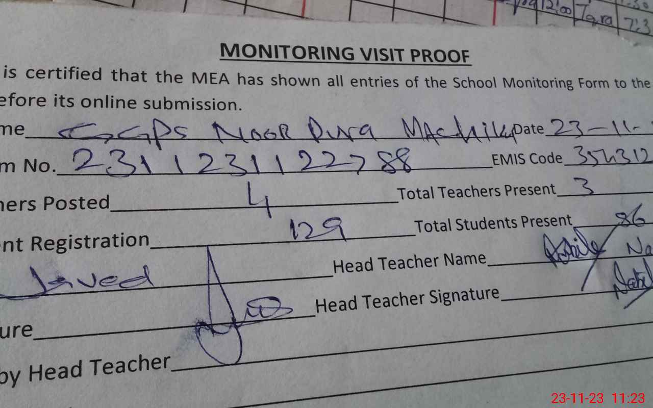 | Attendance Register | Head Teacher | MEA with School | Visit Proof |