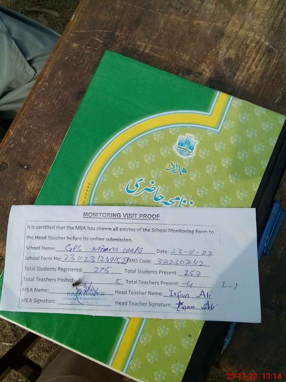 | Attendance Register | Head Teacher | MEA with School | Visit Proof |