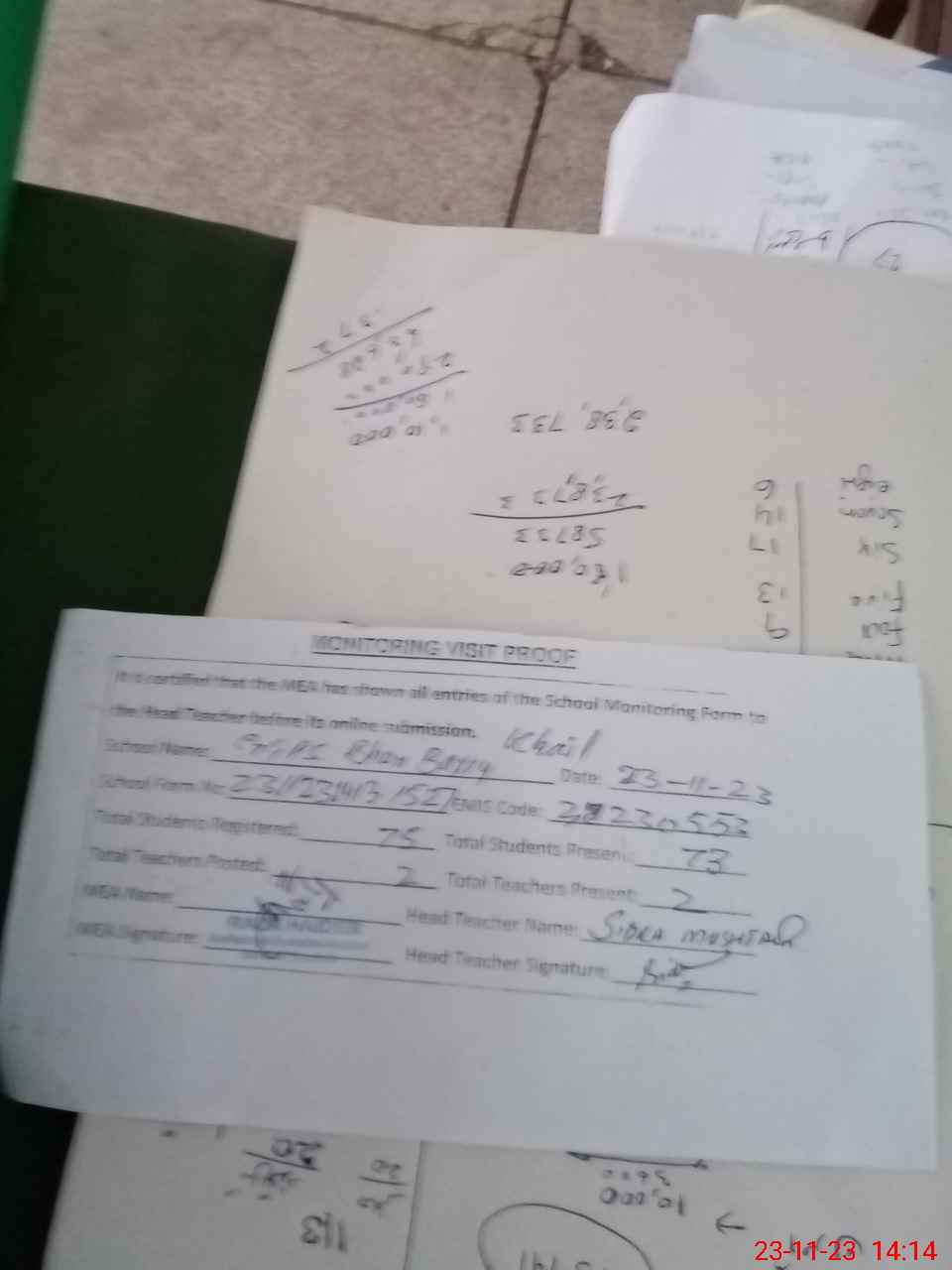 | Attendance Register | Head Teacher | MEA with School | Visit Proof |