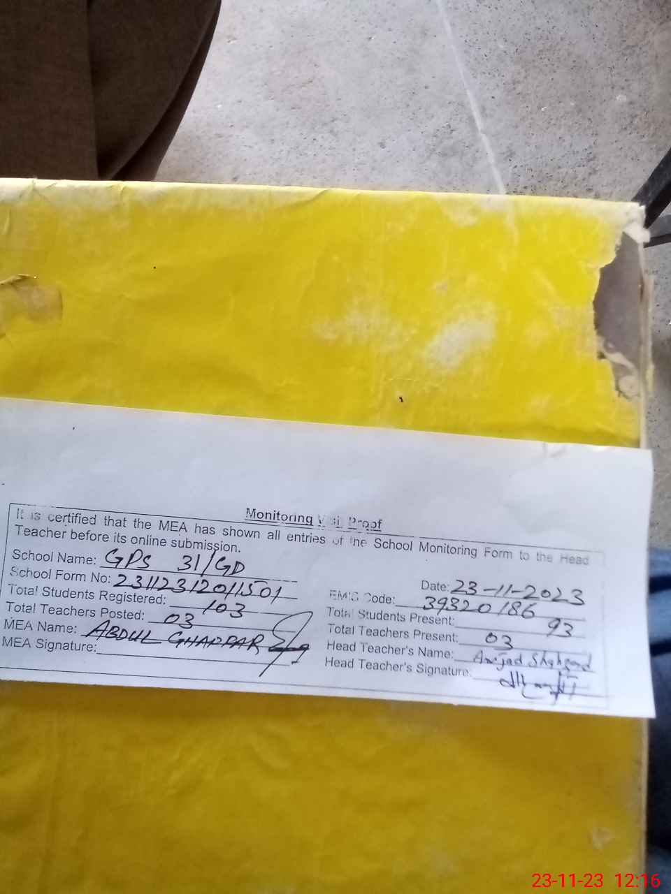 | EMIS Code: 39320186 | Name of School: GPS CHAK NO 31/G.D | |||