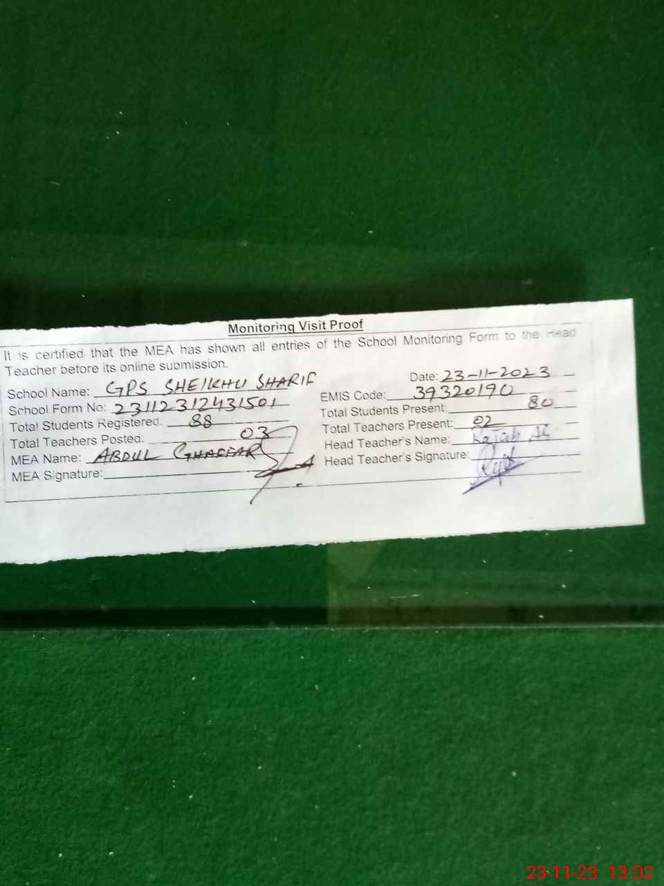 | Attendance Register | Head Teacher | MEA with School | Visit Proof |
