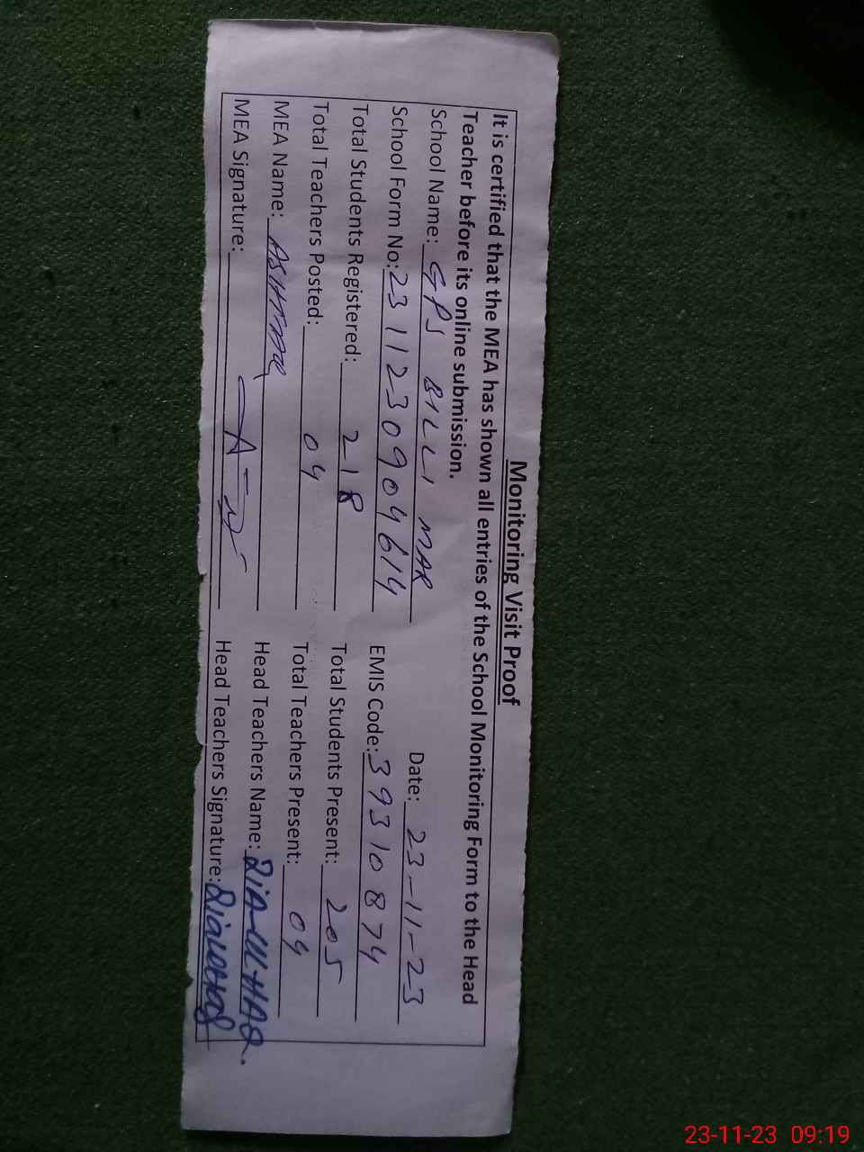 | EMIS Code: 39310874 | Name of School: GPS CHAK BILLI MAR | |||