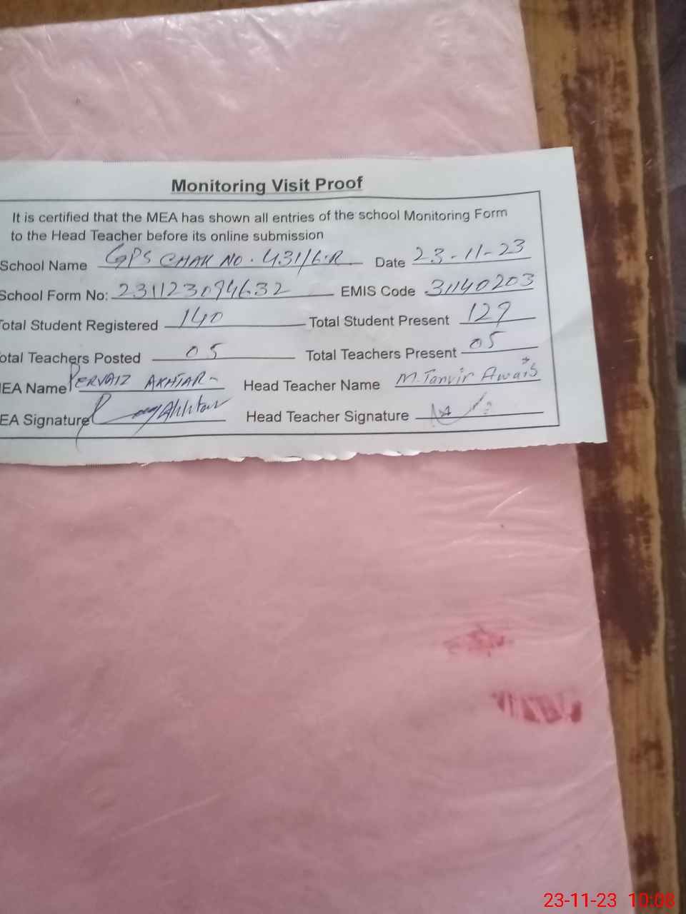 | EMIS Code: 31140203 | Name of School: GPS CHAK NO 431/6-R | |||