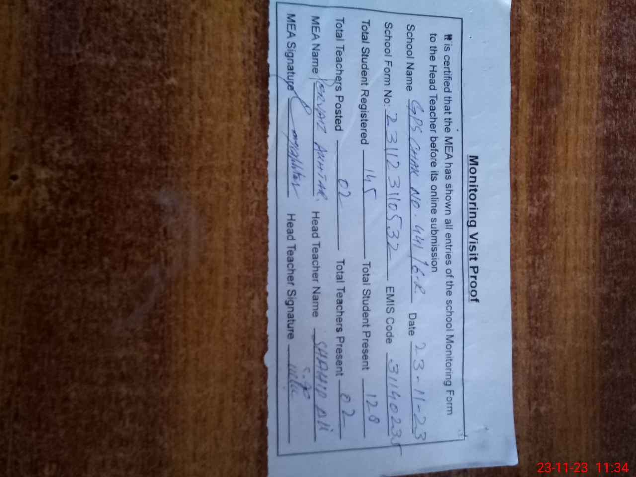 | Attendance Register | Head Teacher | MEA with School | Visit Proof |