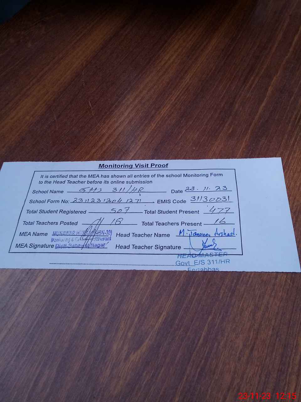 | Attendance Register | Head Teacher | MEA with School | Visit Proof |