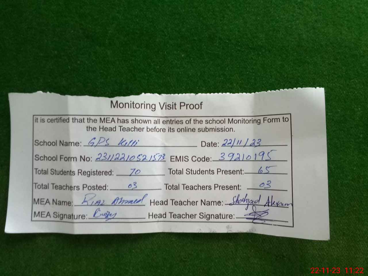 | Attendance Register | Head Teacher | MEA with School | Visit Proof |