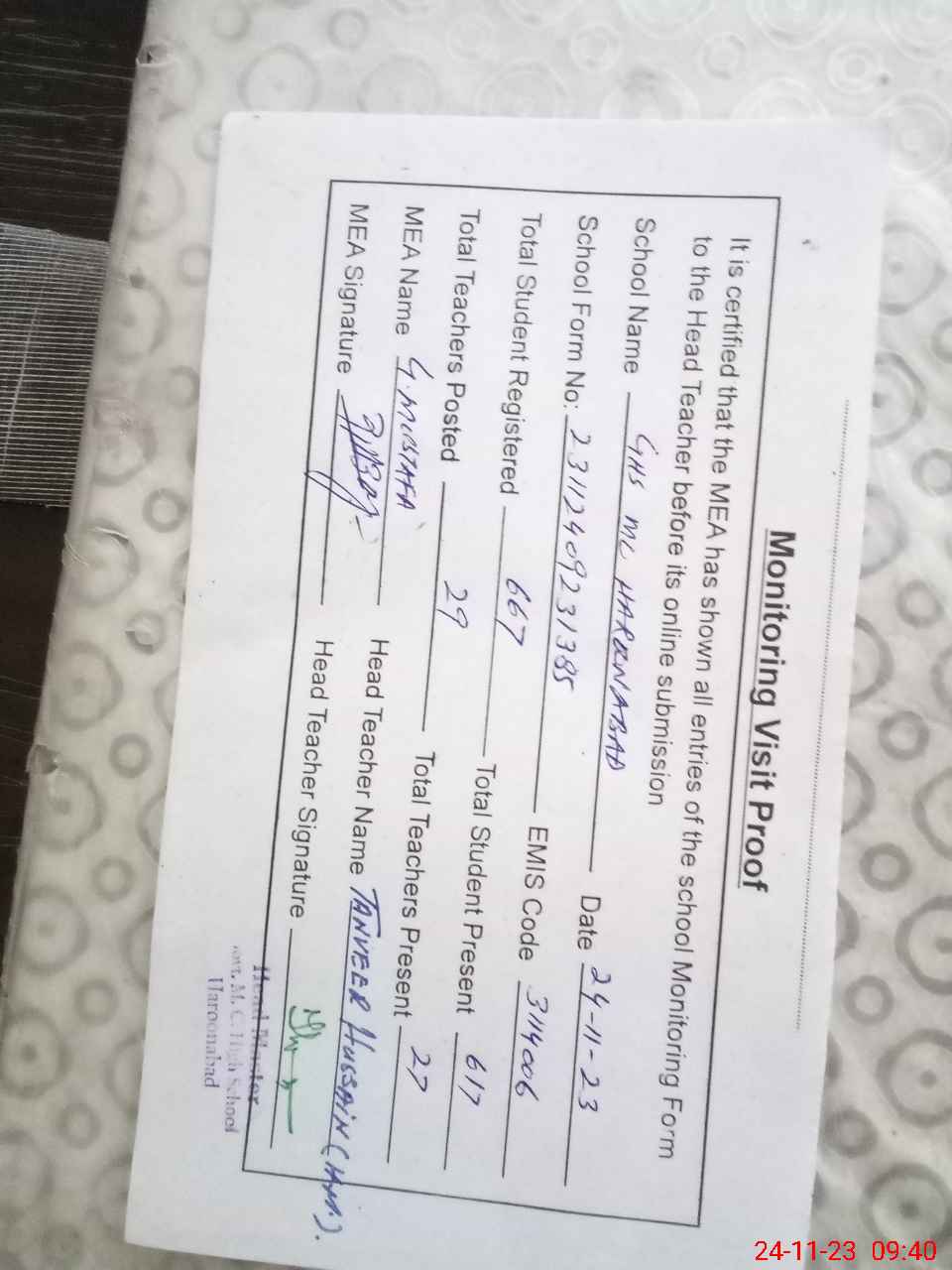 | Attendance Register | Head Teacher | MEA with School | Visit Proof |