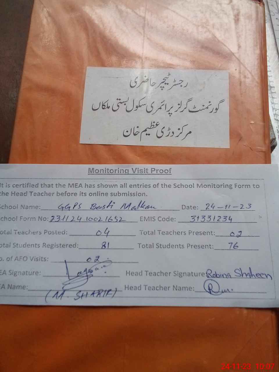 | EMIS Code: 31331234 | Name of School: GGPS BASTI MALKAN | |||