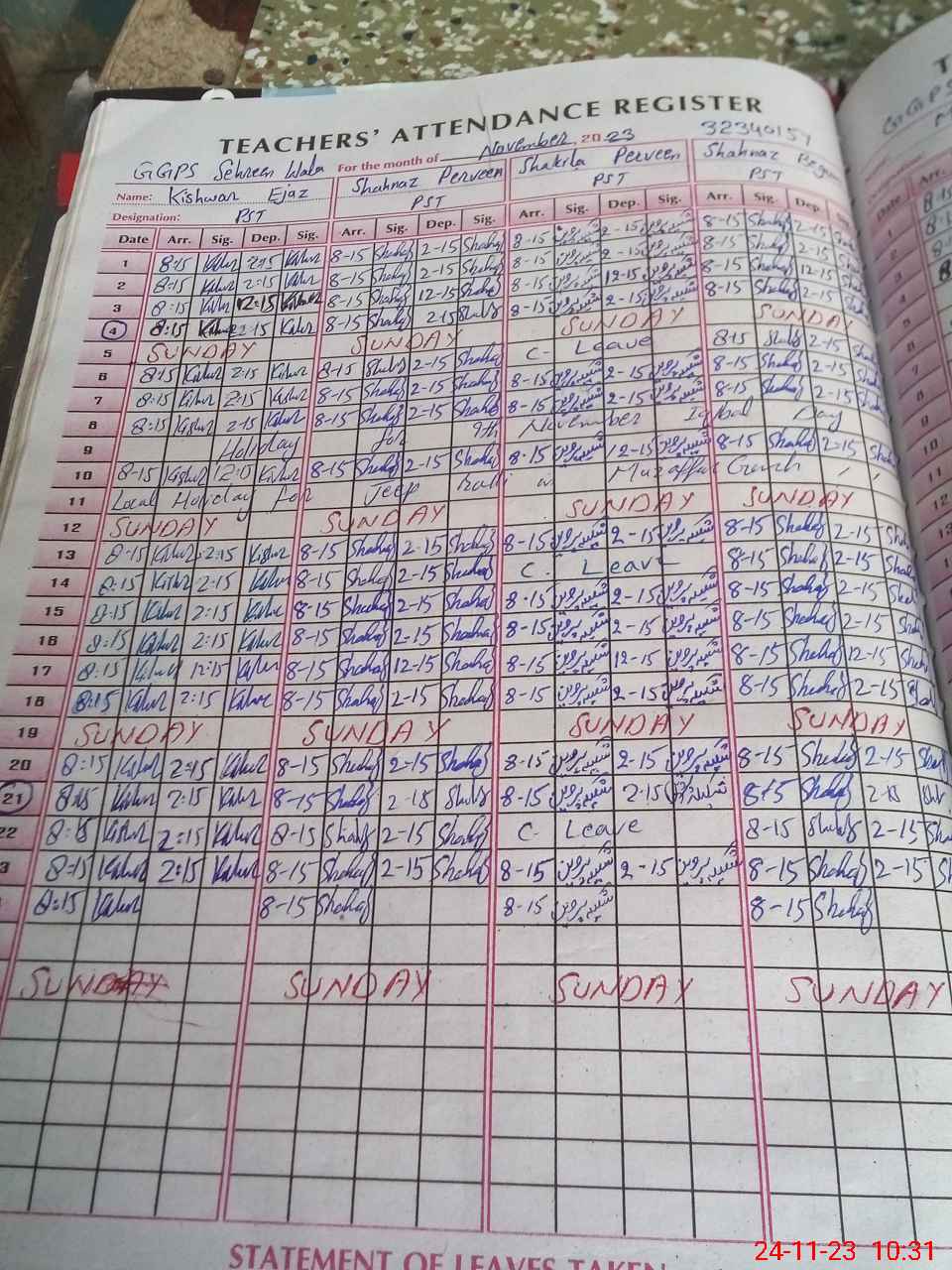 | CNIC | Full Name | Designation | R/C | Absence During Last Calender Month |