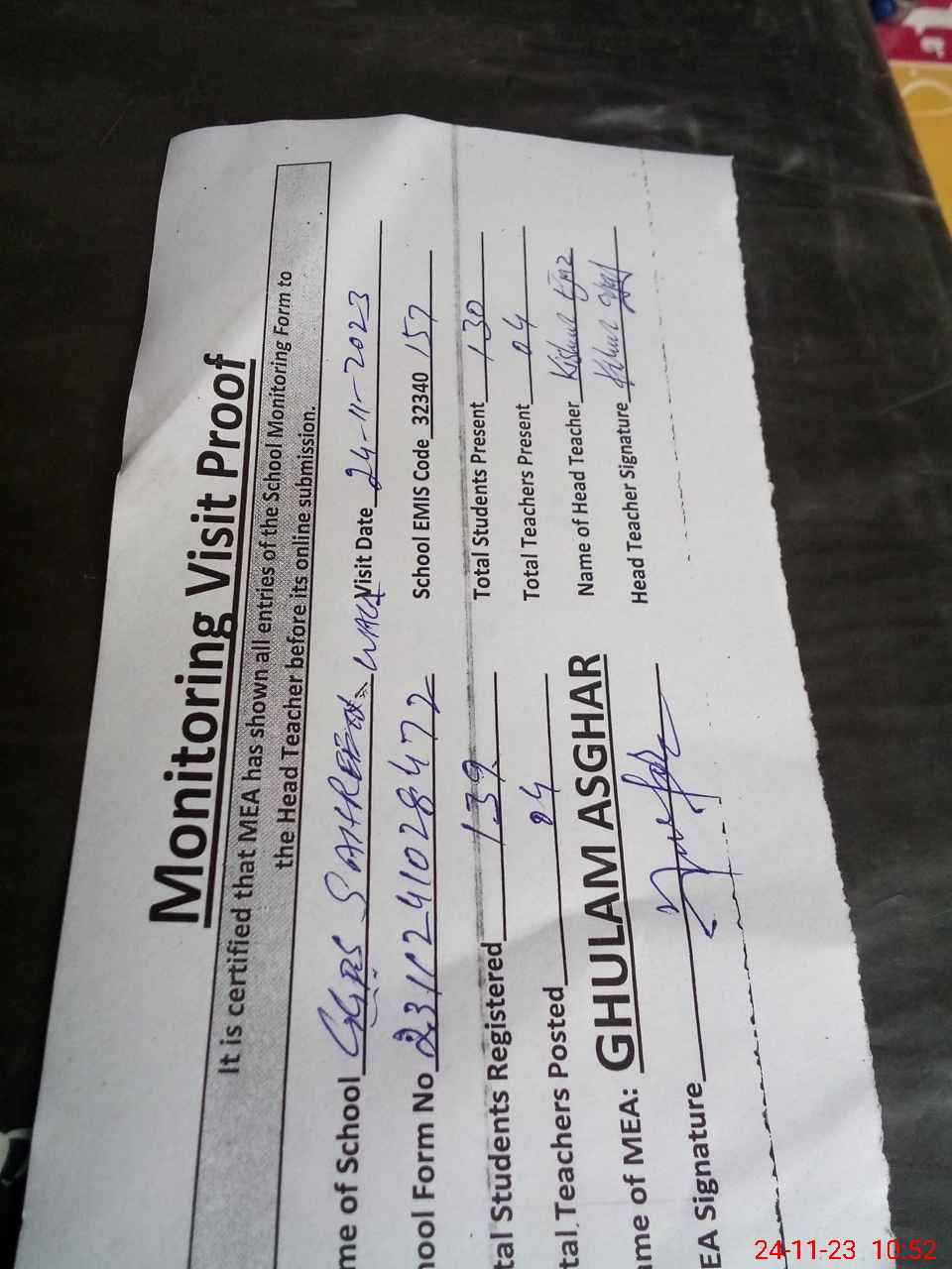| Attendance Register | Head Teacher | MEA with School | Visit Proof |
