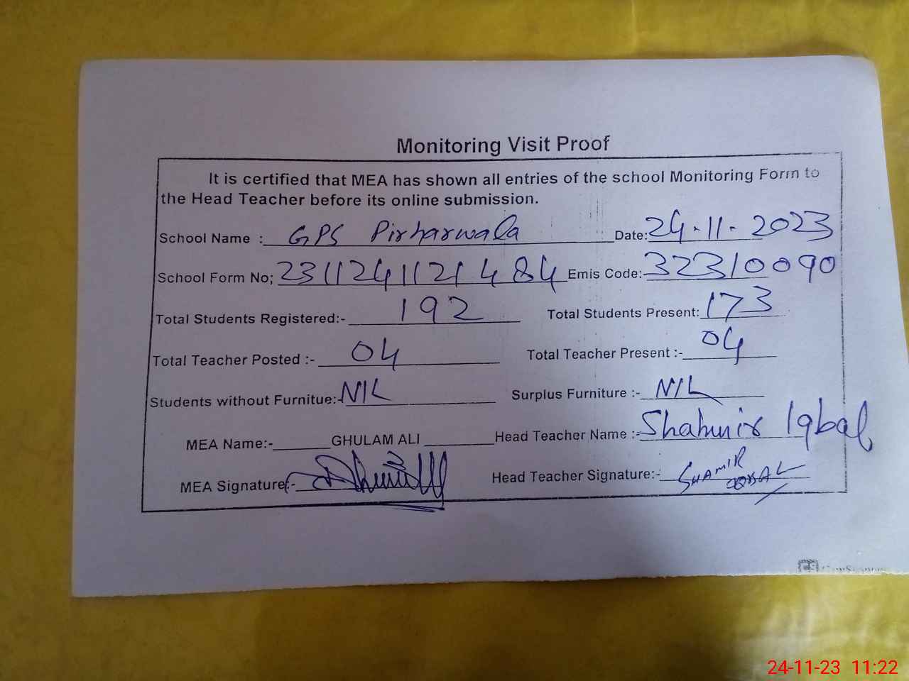 | Monitoring Date: 24-11-2023 | Start Time: 24-11-2023 10:48 AM | End Time: 24-11-2023 11:22 AM | Name of MEA: Gh**** Al**** | |