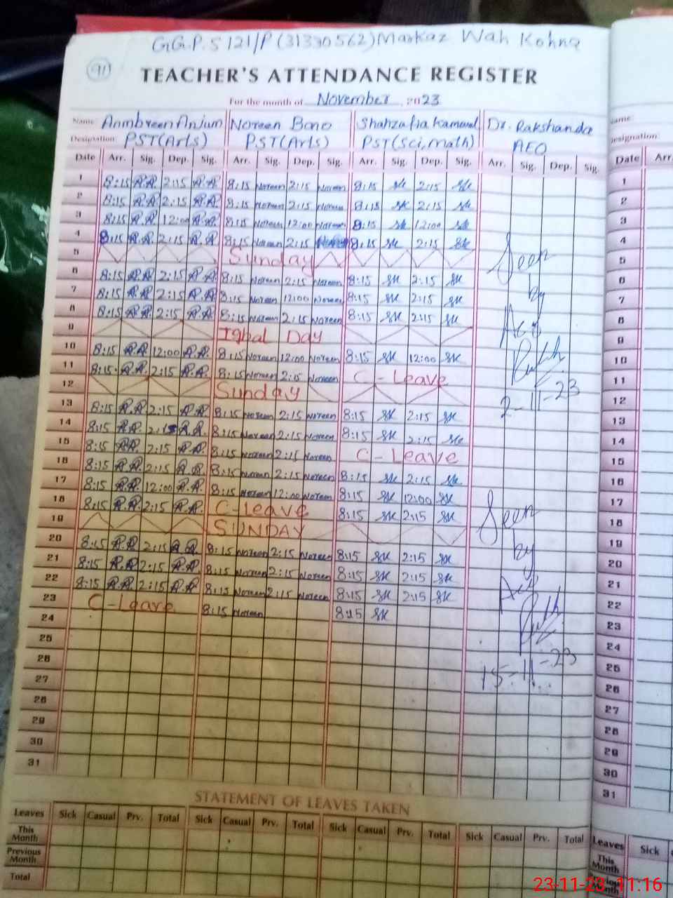 | Monitoring Date: 23-11-2023 | Start Time: 23-11-2023 11:02 AM | End Time: 23-11-2023 11:21 AM | Name of MEA: Sa**** ulHa**** | |