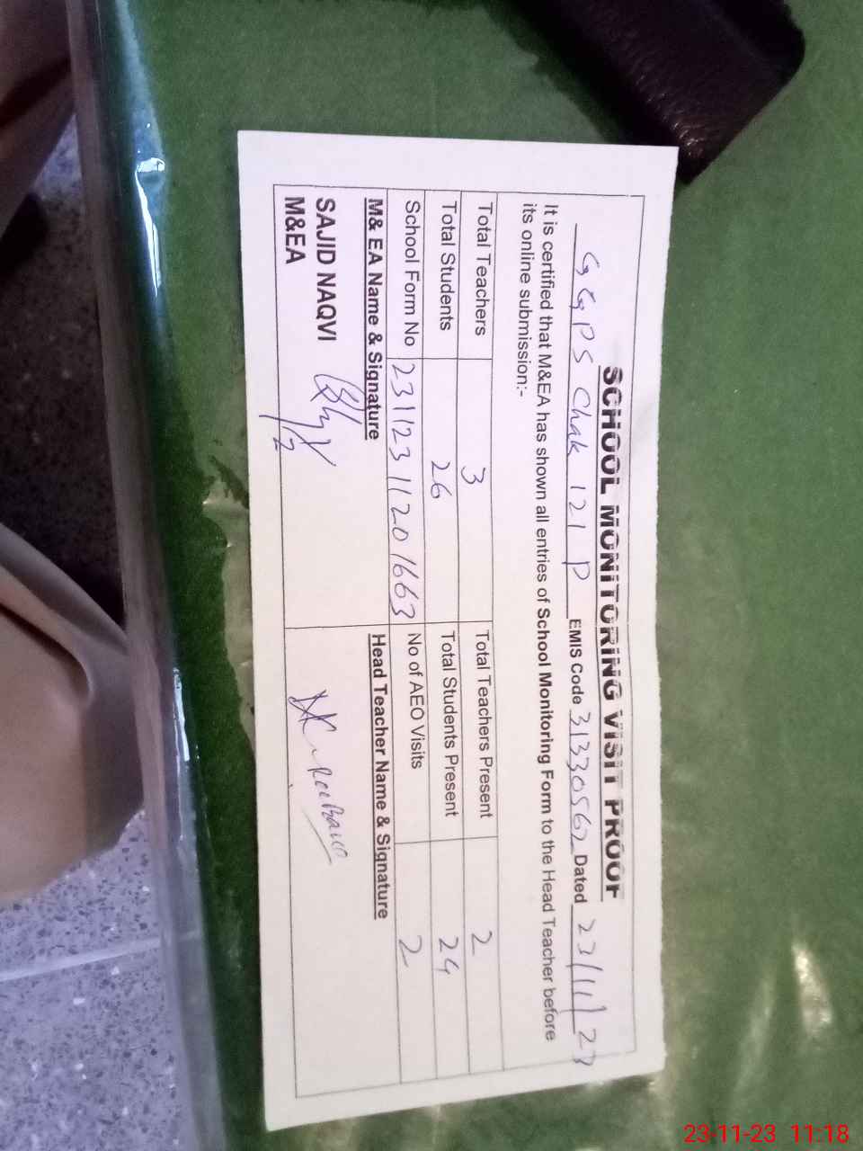 | Attendance Register | Head Teacher | MEA with School | Visit Proof |
