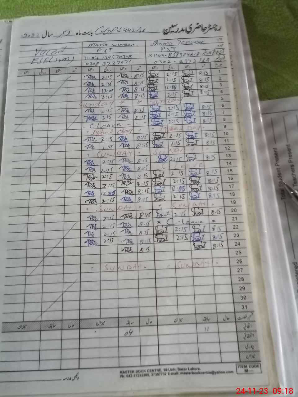 | CNIC | Full Name | Designation | R/C | Absence During Last Calender Month |