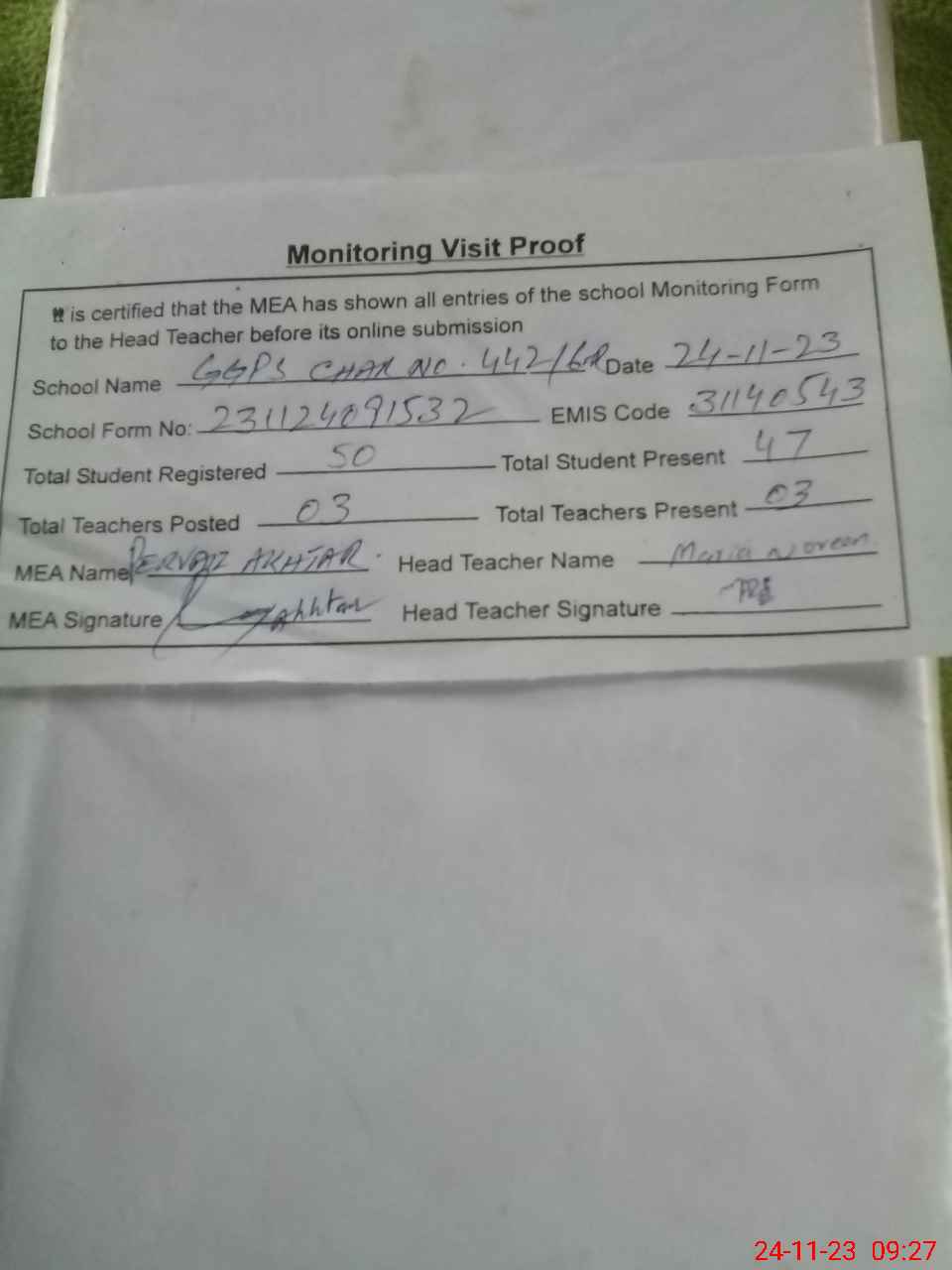 | Attendance Register | Head Teacher | MEA with School | Visit Proof |