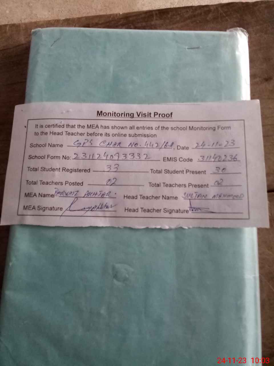 | Attendance Register | Head Teacher | MEA with School | Visit Proof |