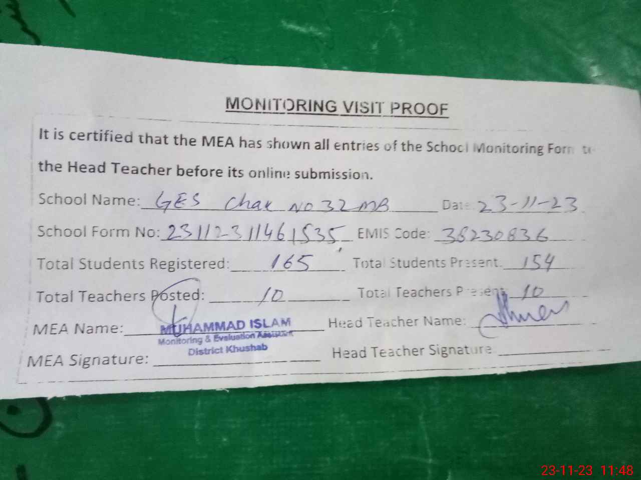 | EMIS Code: 38230836 | Name of School: GES CHAK NO. 32 MB | |||