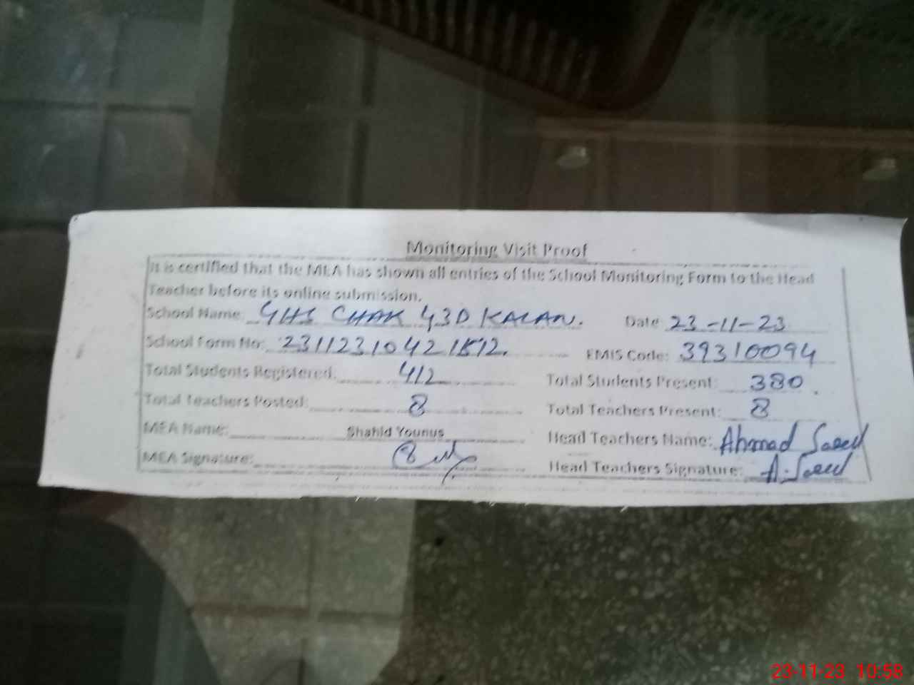 | Attendance Register | Head Teacher | MEA with School | Visit Proof |