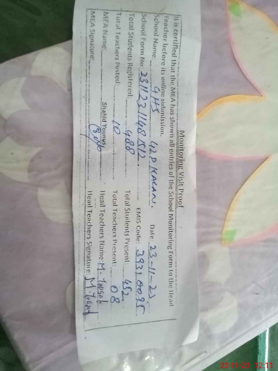 | Attendance Register | Head Teacher | MEA with School | Visit Proof |