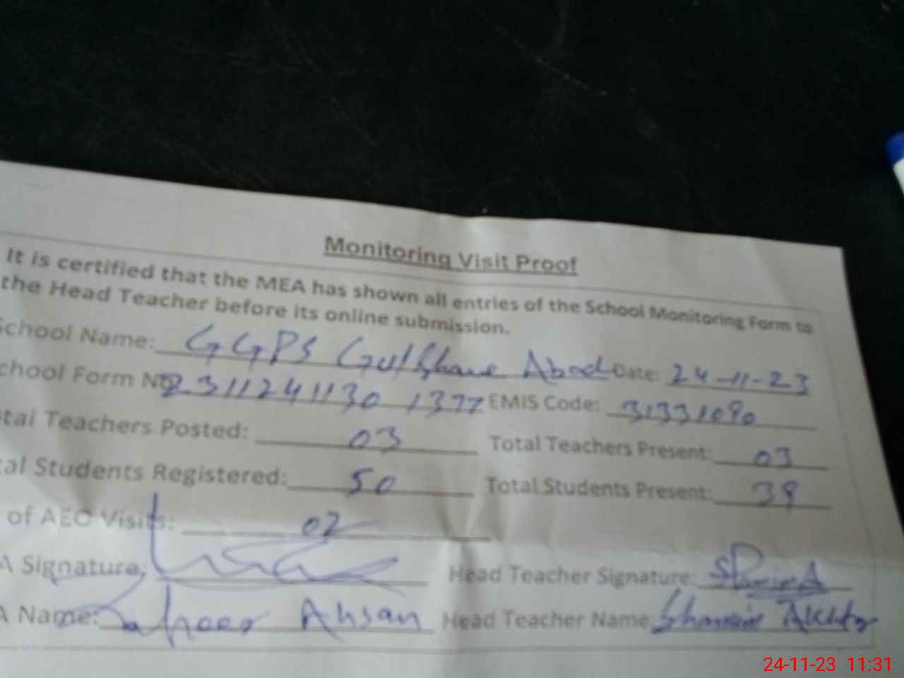 | Attendance Register | Head Teacher | MEA with School | Visit Proof |