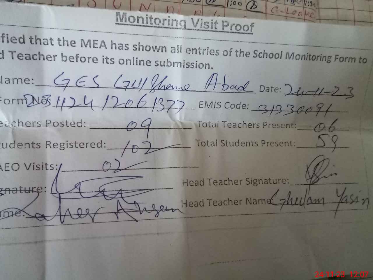 | EMIS Code: 31330091 | Name of School: GES GULSHAN ABAD | |||