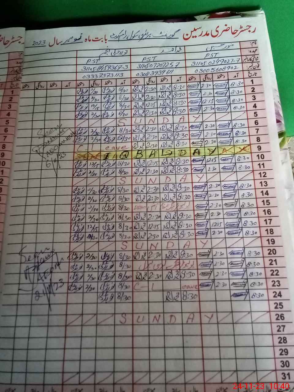 | CNIC | Full Name | Designation | R/C | Absence During Last Calender Month |