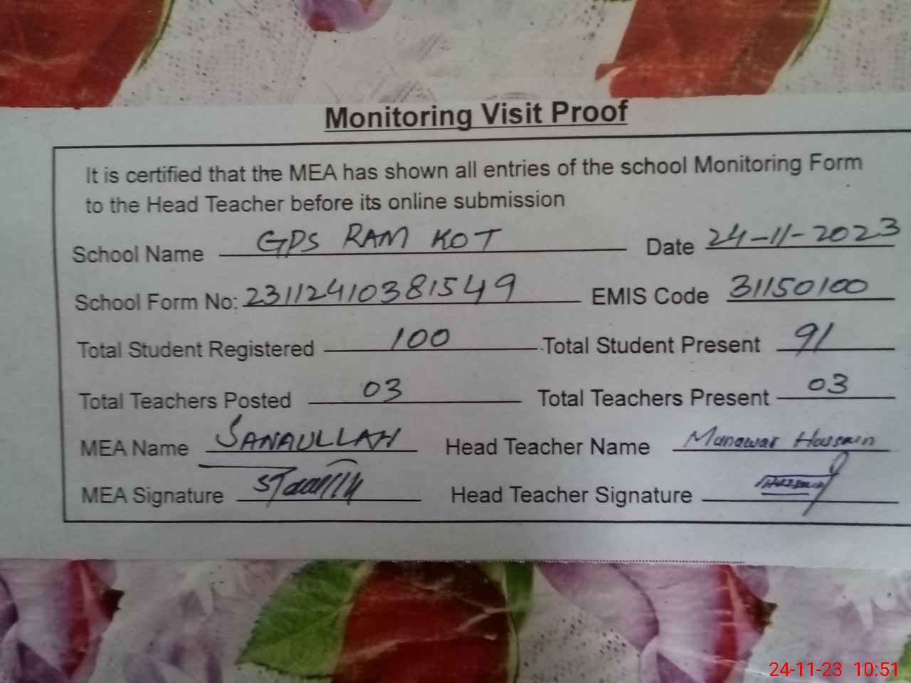 | Attendance Register | Head Teacher | MEA with School | Visit Proof |