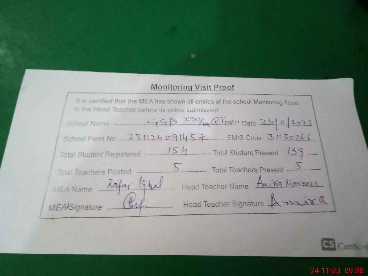 | Attendance Register | Head Teacher | MEA with School | Visit Proof |