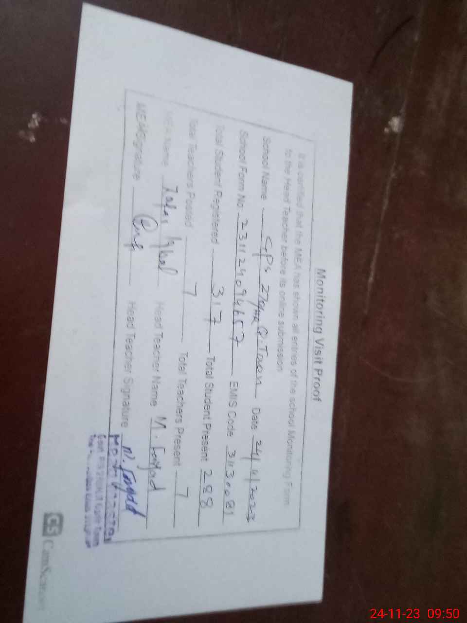 | Attendance Register | Head Teacher | MEA with School | Visit Proof |